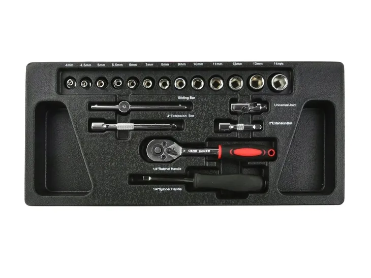 - 13x Nasadka 6-kątna 1/4": 4, 4.5, 5, 5.5, 6, 7, 8, 9, 10, 11, 12, 13, 14 mm