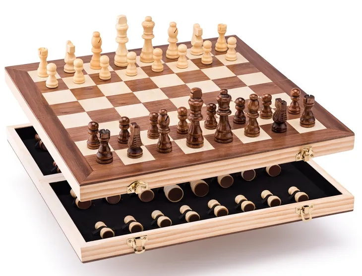 Luksusowy design szachów w praktycznym drewnianym pudełku. Szachownica jest solidnie wykonana jako intarsja dwóch kolorów drewna. Uczy dzieci logicznego myślenia.