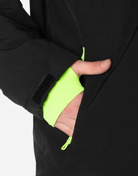 - Dwie zasuwane na kryte wodoodporne zamki kieszenie na SKIPASS na lewym i prawym rękawie kurtki