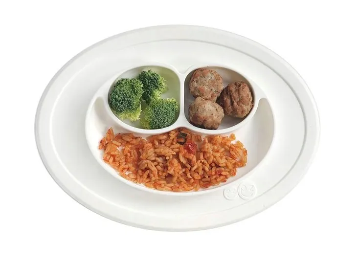 Innowacyjna silikonowa podkładka mocno przywiera do stołu czy innej gładkiej powierzchni, na której ją położysz, dzięki czemu małe dziecko nie będzie w stanie jej przesunąć czy zrzucić. Trójdzielny talerz pozwala podzielić posiłek na porcje, co ułatwi malcowi naukę samodzielnego jedzenia, a z czasem także – rozpoznawanie kategorii pokarmów. Dodatkowo, zaprojektowany podział ułatwi rodzicowi podanie posiłku złożonego z odpowiedniej ilości warzyw i innych ważnych składników żywieniowych. Radosny wygląd – dwie mniejsze przegródki przypominają kształtem oczy, a większa uśmiech – sprawia, że domowe posiłki będę maluchom pozytywnie się kojarzyć. Nadaje się do serwowania zarówno zimnych, jak i ciepłych potraw.